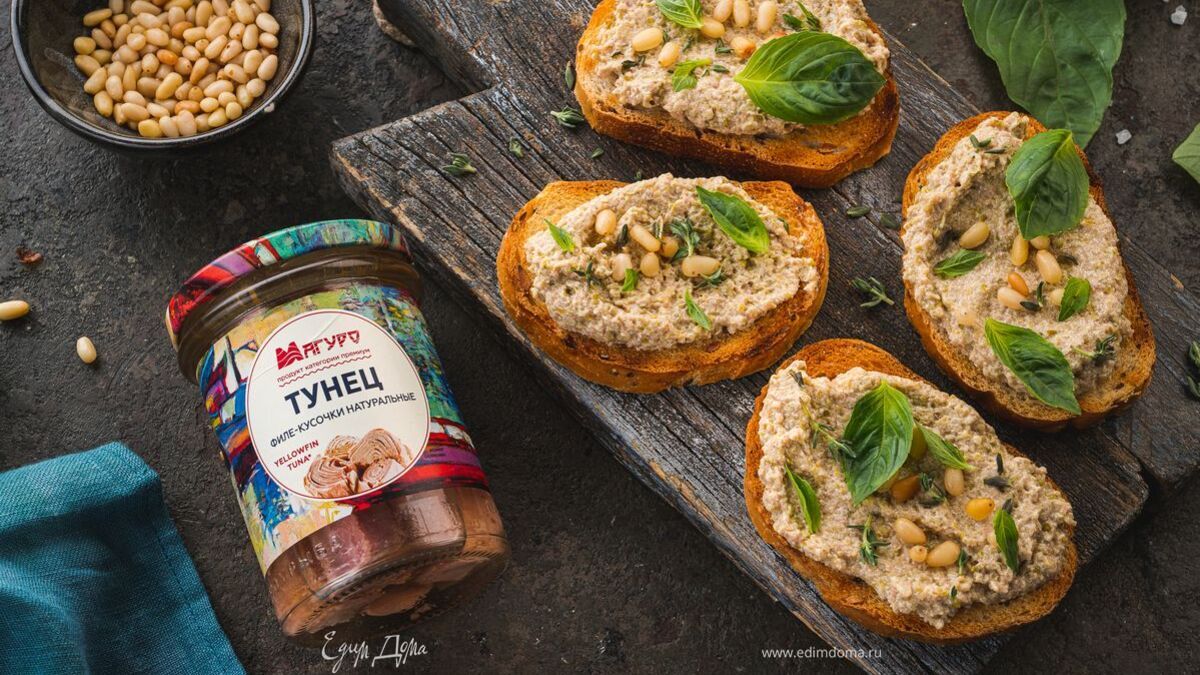 Выложите тапенаду на зерновой хлеб, украсьте поджаренными кедровыми орехами, базиликом и тимьяном. - Шаг 6