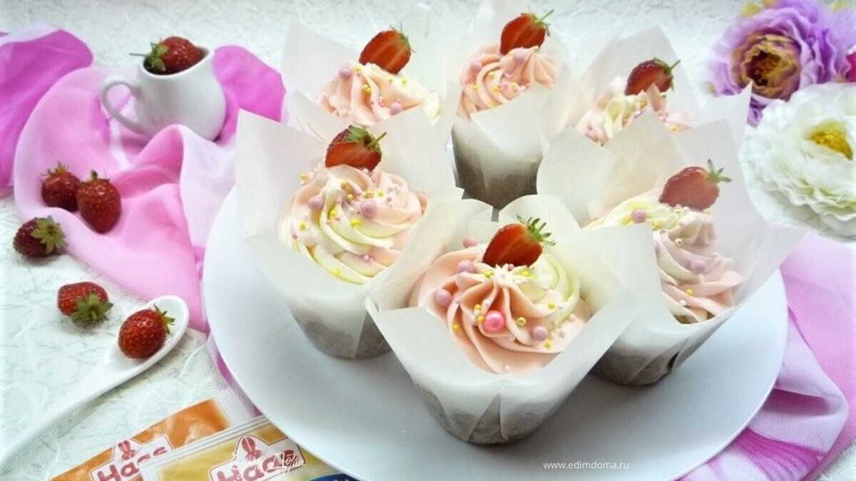 Украшаем ягодами клубники и кондитерскими посыпками! Такие нежные, красивые капкейки обязательно поднимут настроение, если за окном хмурая, дождливая погода. Приятного чаепития!