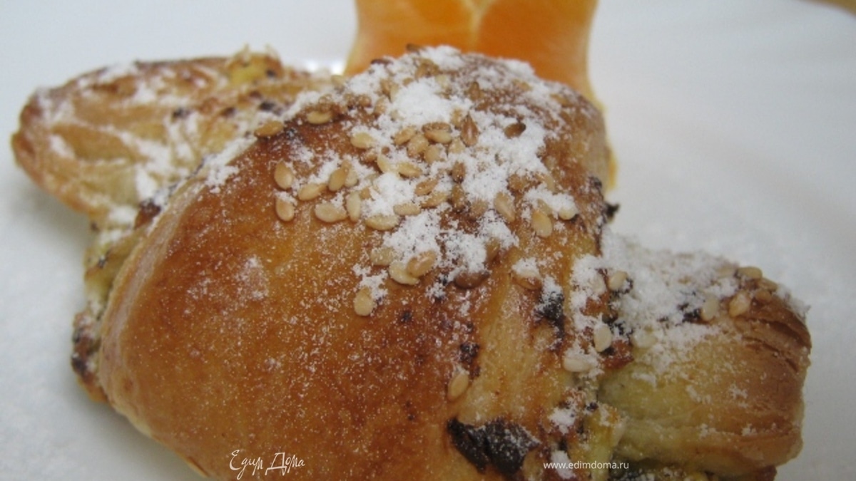 - Шаг 1Тесто подготавливаем по рецепту на упаковке. Затем каждый пласт разрезаем вдоль пополам. А потом каждый прямоугольник делим по диагонали на 2 треугольника. Это заготовки для круассанов. Начинка. Яйцо взбиваем. Шоколад рубим мелко, добавляем рикотту, цедру мандарина, ванилин. Далее смазываем яйцом треугольник теста, кладем небольшой слой начинки. Заворачиваем с большей стороны к острому углу. Этот круассан ставим подходить в теплое место, примерно час. Затем смазываем яйцом, посыпаем кунжутом и выпекаем минут 15. Готовый круассан посыпаем сахарной пудрой.