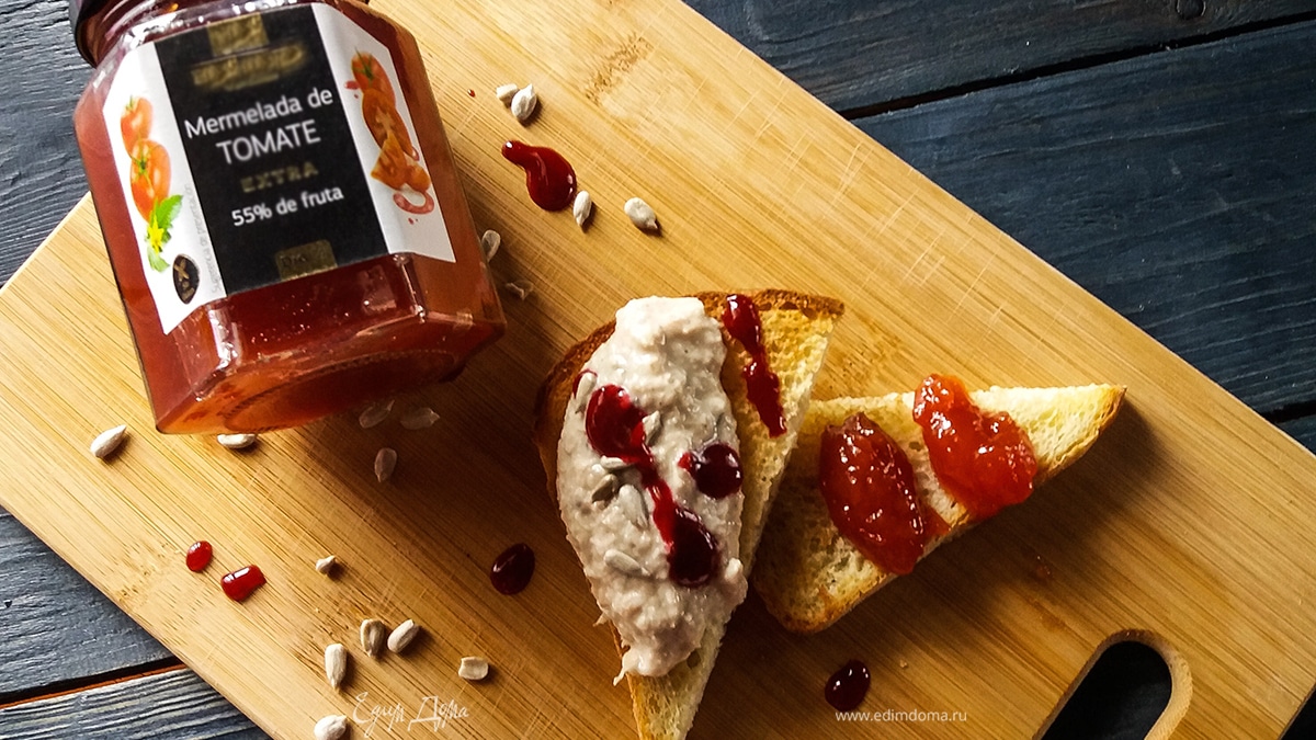 Подавать с хрустящим хлебом, крекерами. Очень вкусно с домашним джемом из красной смородины. У меня сегодня томатный джем из Испании и домашний соус из клюквы и