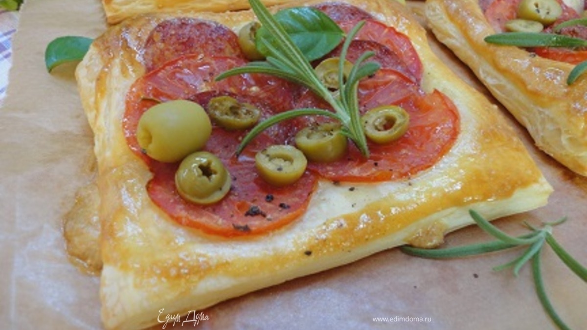 Вкусные прямоугольнички из слоеного теста с помидорами, салями, оливками (или маслинами) и розмарином или базиликом. Это и закуска, и легкий обед с порцией зеленого салата.
