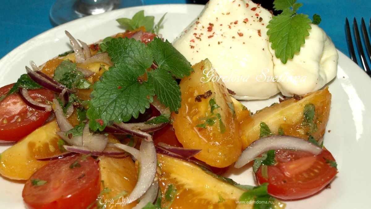 Летний салат из томатов — самый вкусный. Самая ароматная зелень, самые ароматные и вкусные томаты, сымый вкусный сыр из летнего молока. Такой салат — отличный летний завтрак.