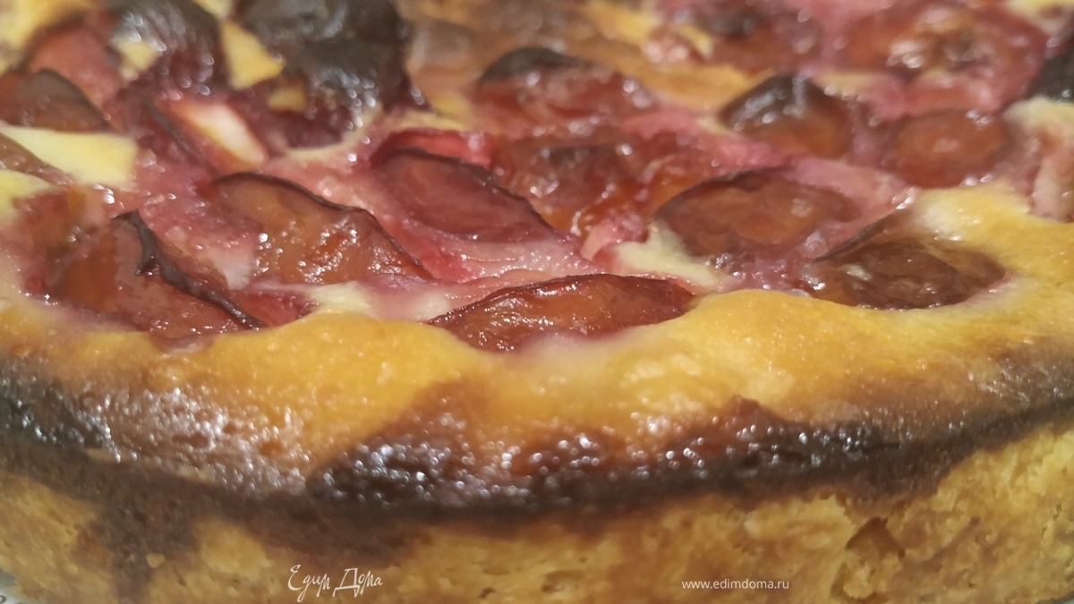 Распределяем тесто по форме, делаем стенки высотой 3 см, выкладываем нарезанные сливы и заливаем сливы заливкой. Ставим в разогретую до 180°C духовку на 60 минут. - Шаг 6