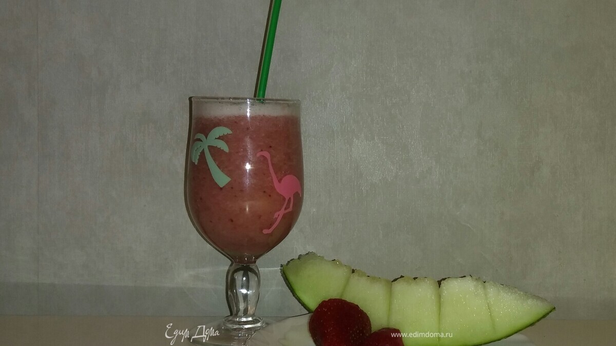 Кладем в блендер кубики дыни и ягоды клубники. Измельчаем все до состояния пюре. Затем раскладываем пюре по бокалам (примерно половину бокала) и добавляем минеральную газированную воду. Перемешиваем и наслаждаемся. Приятного аппетита!