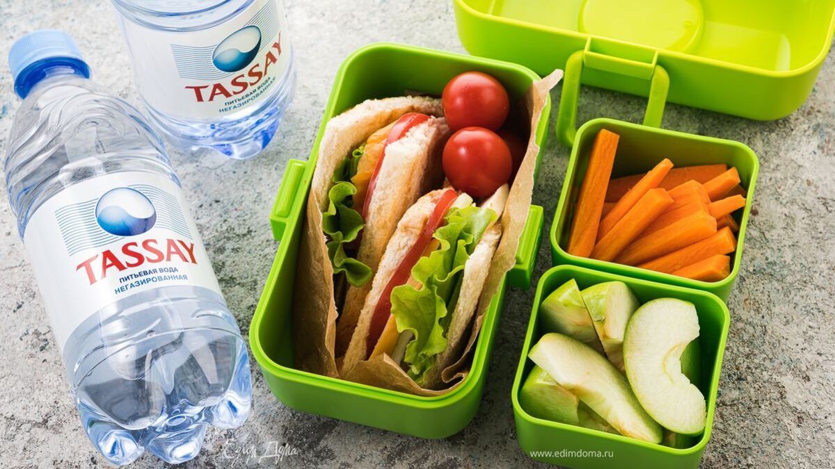 Положите сэндвичи в контейнер, добавьте бутылку негазированной воды Tassay и контейнеры с морковными палочками и кусочками яблок — питательная и сытная ссобой для ребенка готова!