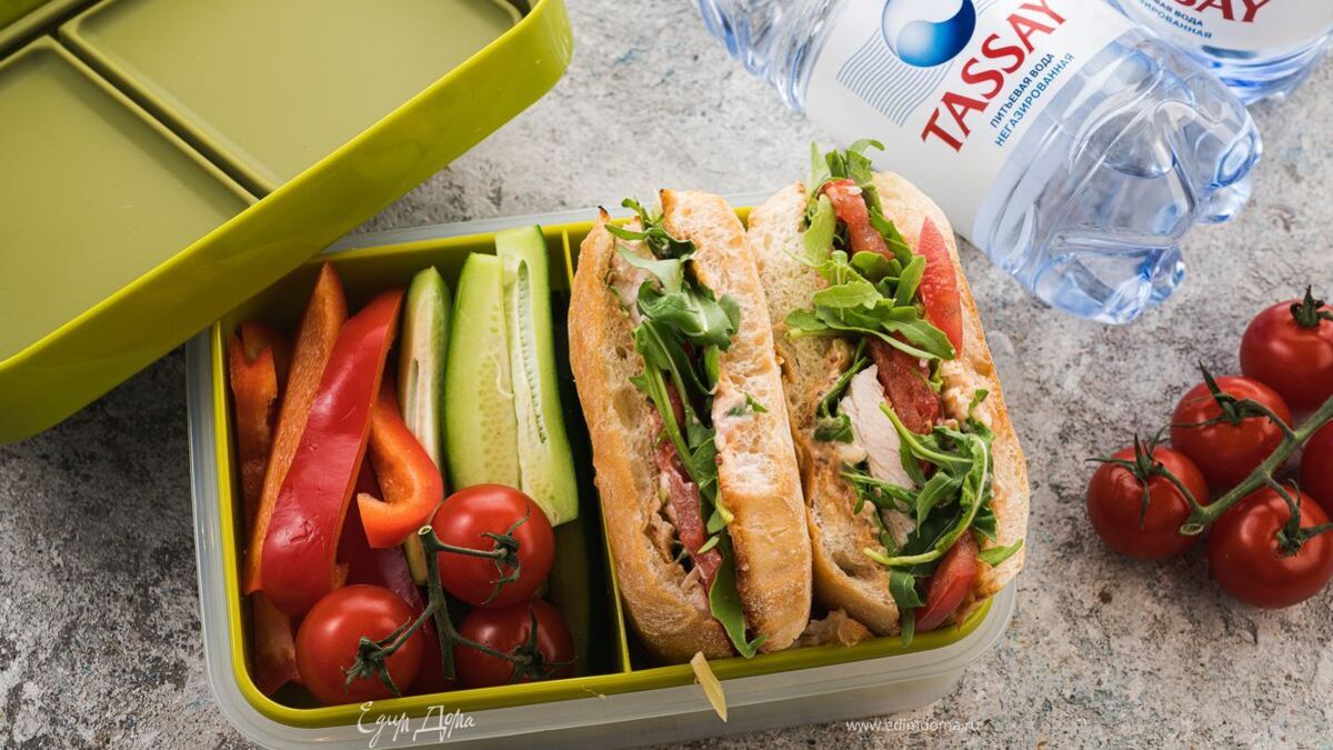 Положите чиабтту в контейнер вместе со свежими овощами и возьмите с собой негазированную воду Tassay.