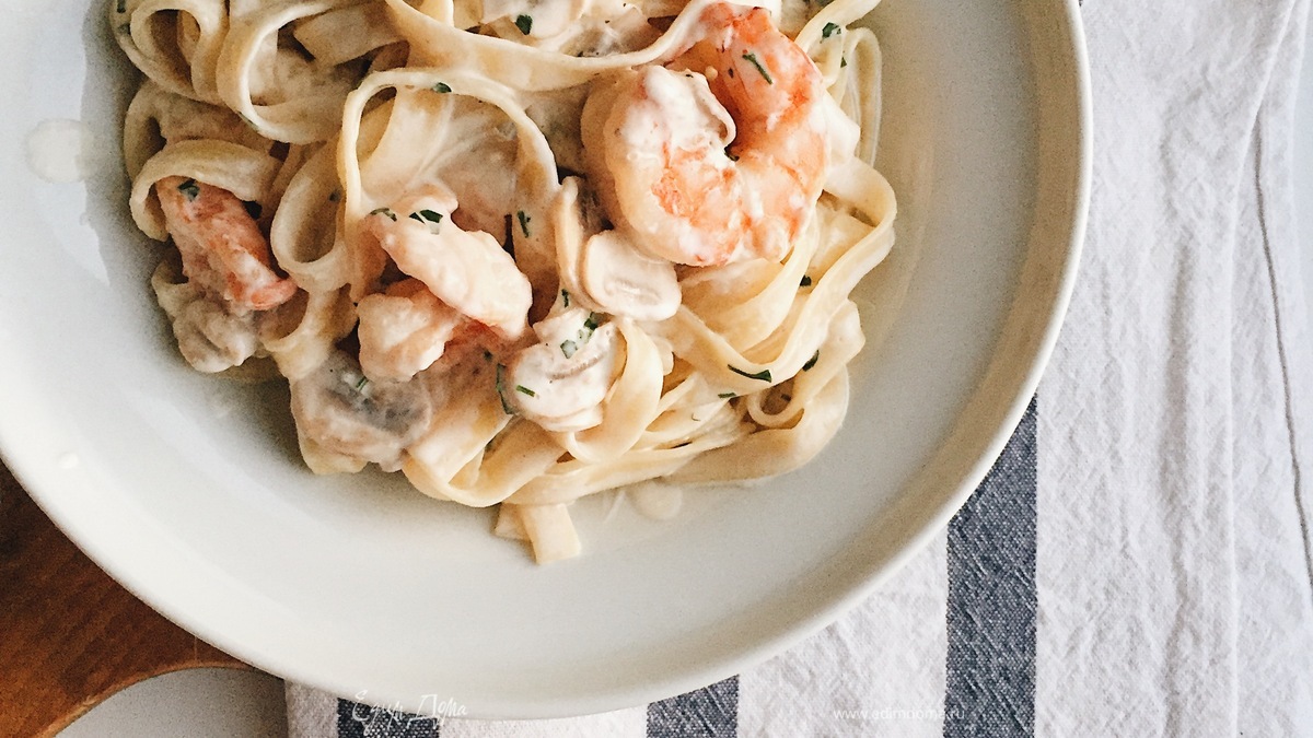 - Шаг 3Выбросить чеснок, в масло выложить очищенные креветки. Обжарить на сильном огне до готовности, вернуть грибы, перемешать, залить сливками и накрыть крышкой на 5 минут, томить на самом медленном огне.