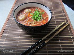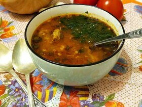 Готовый суп разлить по тарелкам, украсить кусочками лимона и свежей зеленью.