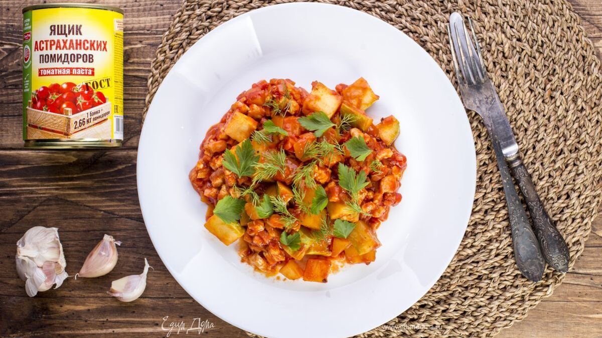 Добавьте томатную пасту ТМ «Ящик астраханских помидоров». Тушите под крышкой. После закипания бульона посолите, поперчите. Тушите до готовности. - Шаг 8