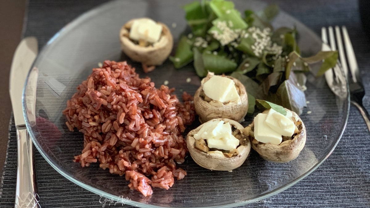Все! Можно подавать как самостоятельное блюдо (тогда этот рецепт — одна порция), а можно с гарниром. У меня на гарнир красный рис, в него можно добавить оставшиеся ножки от грибочков.