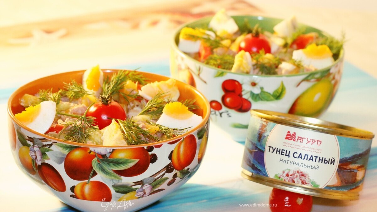 Откройте банку консервированного тунца ТМ «Магуро», слейте жидкость. Выложите рыбу в салатник. Положите яйца, посолите, поперчите и перемешайте. Майонез добавляйте перед подачей. - Шаг 5