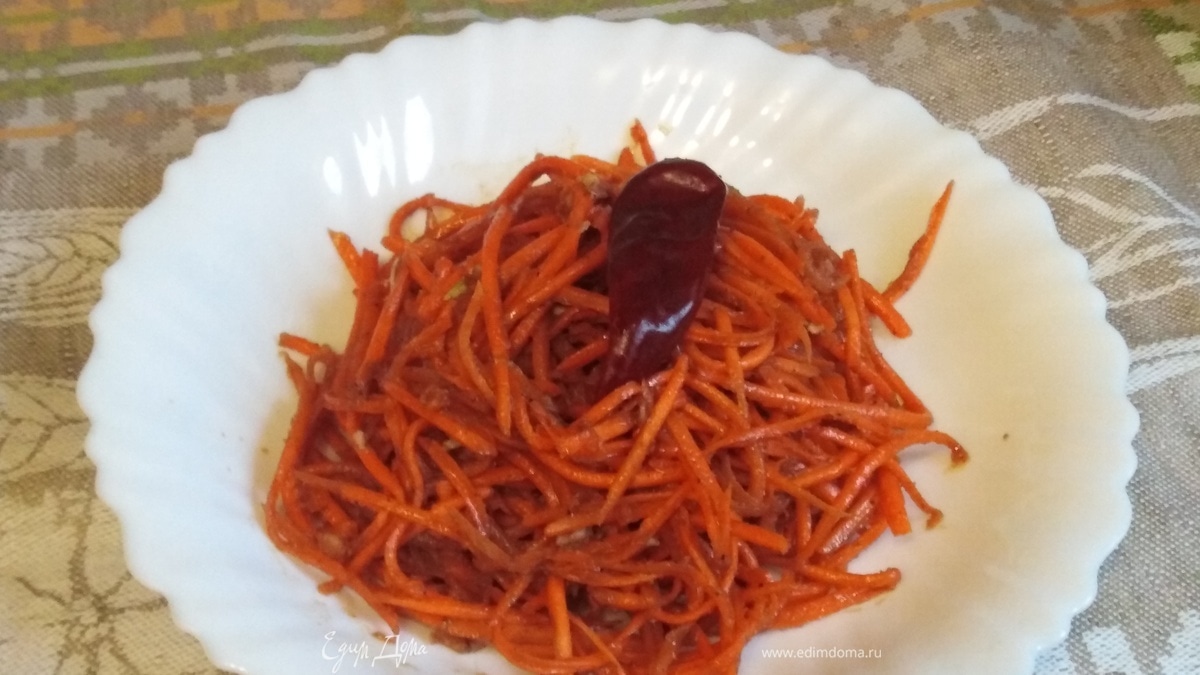 Морковь натереть на специальной терке. Чеснок измельчить ножом. Соединить морковь, чеснок, кориандр, сахар, соль, паприку, острый перец, уксус и растительное масло. Перемешать. Дать настояться в течение 30 минут. - Шаг 2
