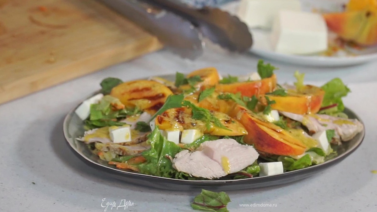 На блюдо выложить салатный микс с заправкой, добавить кусочки индейки и нарезанную кубиками фету. Сверху положить запеченные на гриле персики. Полить салат оставшейся заправкой и посыпать листочками мяты.