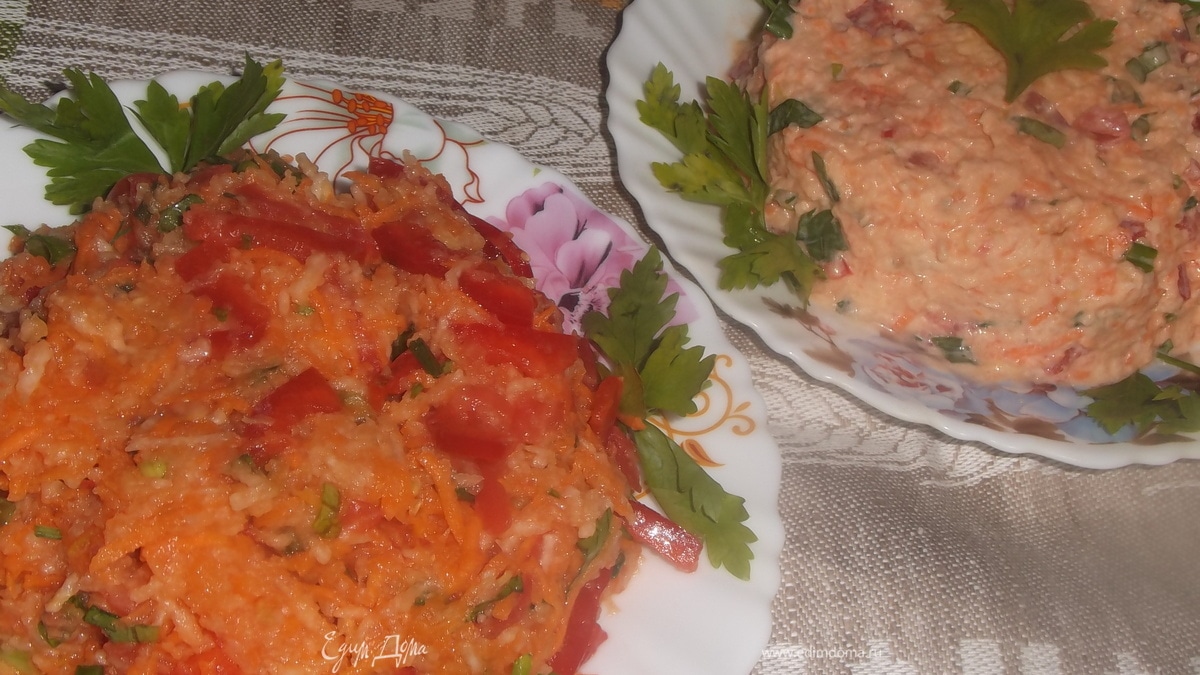 Нарезать помидор, перец, петрушку и зеленый лук. Посолить. Добавить уксус и масло. Перемешать. Заправку можно сделать любую на ваш вкус. Я мужу сделала с майонезом, себе — с маслом. Приятного аппетита!