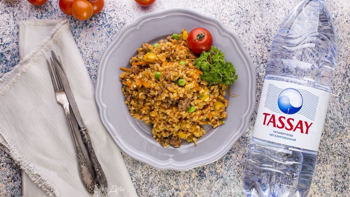 Влейте воду Tassay к овощам и фаршу. Тушите 15 минут. - Шаг 6