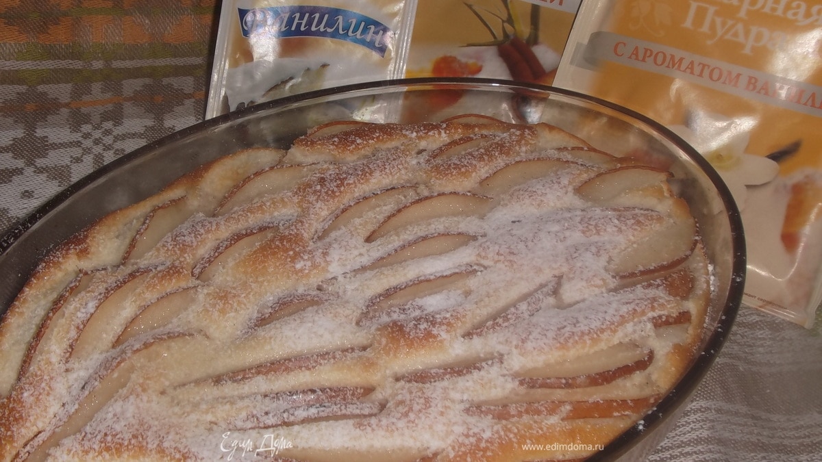 Форму смазать сливочным маслом. Залить тестом. Сверху выложить нарезанные на дольки груши. Поставить в разогретую духовку. - Шаг 7