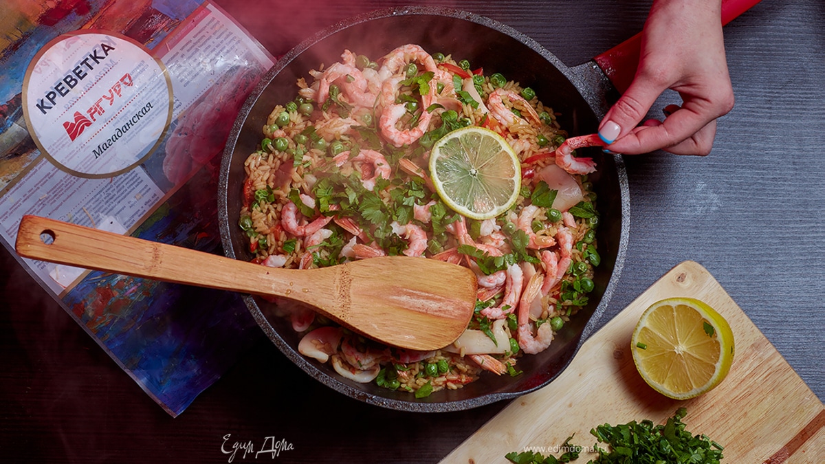 Паэлья — простое и вкусное блюдо испанской кухни. Прелесть его главным образом в том, что положить в него можно абсолютно все! Наша любимая — с морепродуктами. Тем более у ТМ «Магуро» шикарные креветки! - Шаг 2