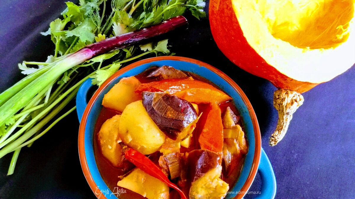 Очистите картофель и нарежьте его кубиками около 2 см. Баклажаны и тыкву также нарежьте примерно кубиком в 2 см. Добавьте баклажаны и картофель к луку, перемешайте и обжарьте вместе еще в течение нескольких минут. - Шаг 2