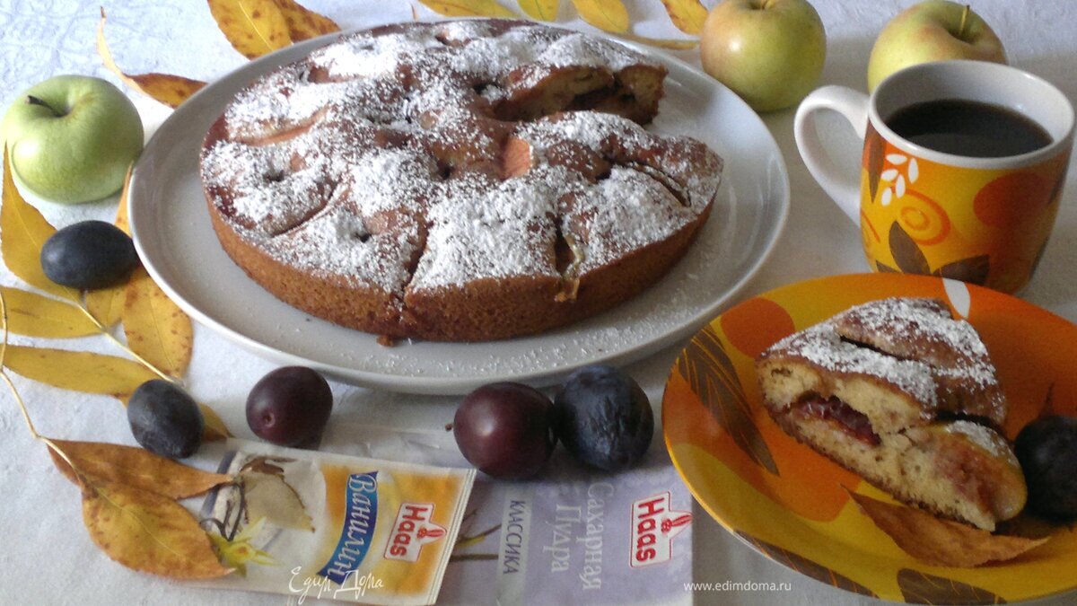 Простой в приготовлении, вкусный и мягкий пирог со сливами и яблоками. Пикантную нотку пирогу придает сироп, сваренный из карамелизированного сахара и красного вина. Для выпечки я использовала продукцию Haas — ванилин и сахарную пудру. Для детей вместо вина можно взять виноградный или гранатовый соки. Пирог прекрасно подойдет к чаепитию в кругу семьи. Готовьте и угощайтесь!