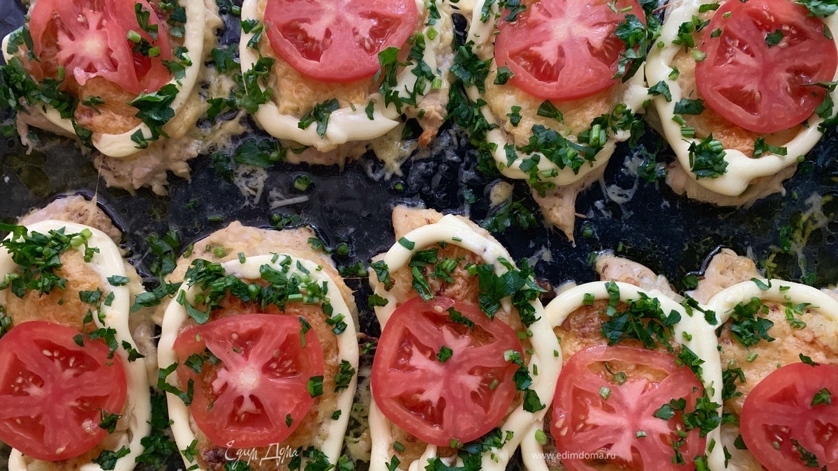 Нарезаю дольками помидор, кладу на отбивные. По желанию добавьте зелень. Возвращаю отбивные в духовку на 10 минут. - Шаг 6