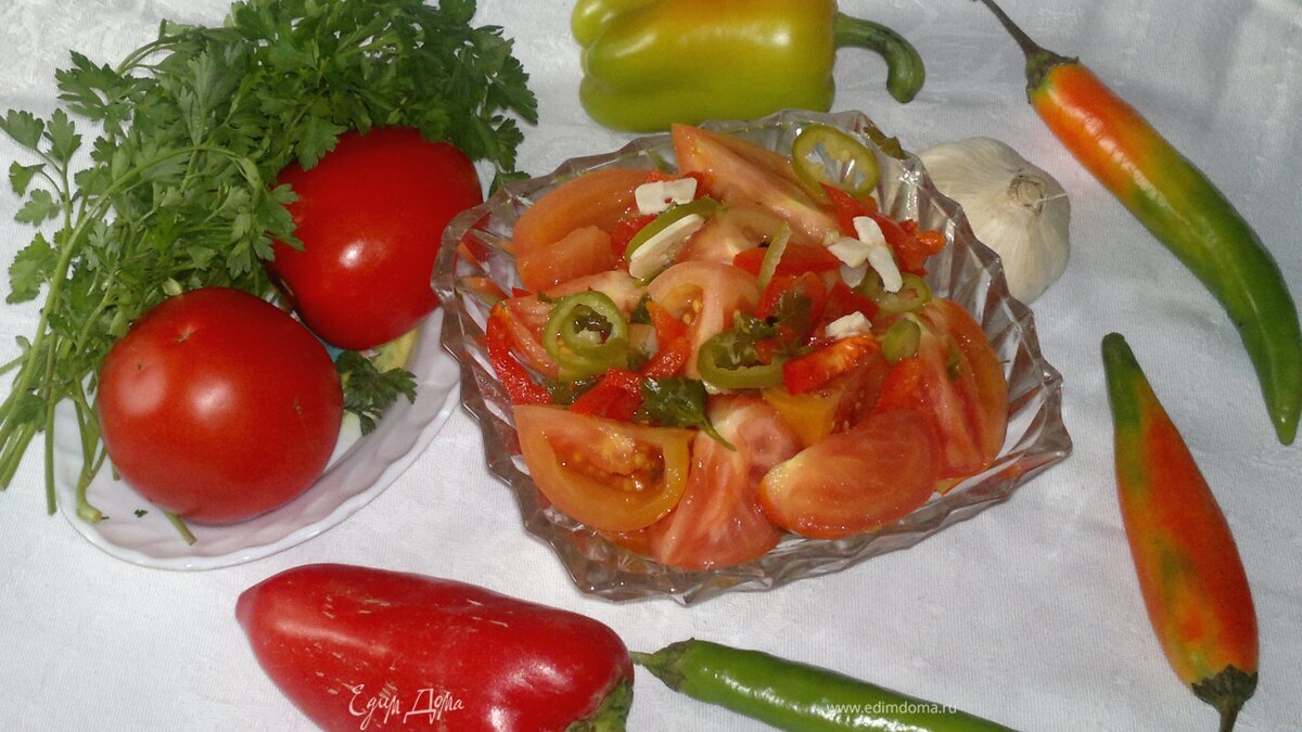 Острая закуска из бурых помидоров готова. Можно подавать ее к мясу, рыбе, любым несладким блюдам, несладкой выпечке.
