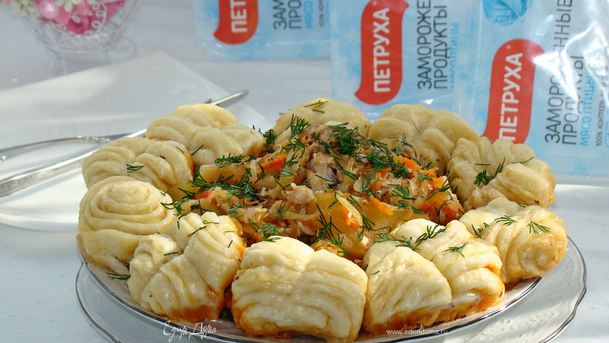 Теперь приступаем к сервировке стола. Штрудли можно подавать как порционно, так и на общем блюде, посыпав рубленой зеленью.