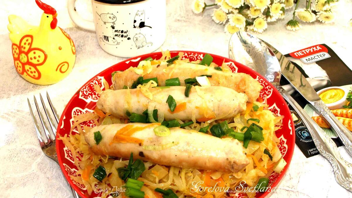Капуста, тушенная с куриными колбасками