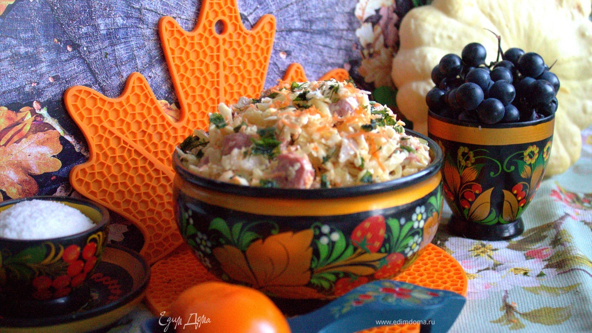 Салат от моей свекрови теперь готовит мой муж. Праздничный вариант — с отварной мягкой говядиной, но в будни мы добавляем самый разный мясной набор: курица, готовое мясо, мясо с прослоечкой... Сегодня покажу вариант и с колбасками.