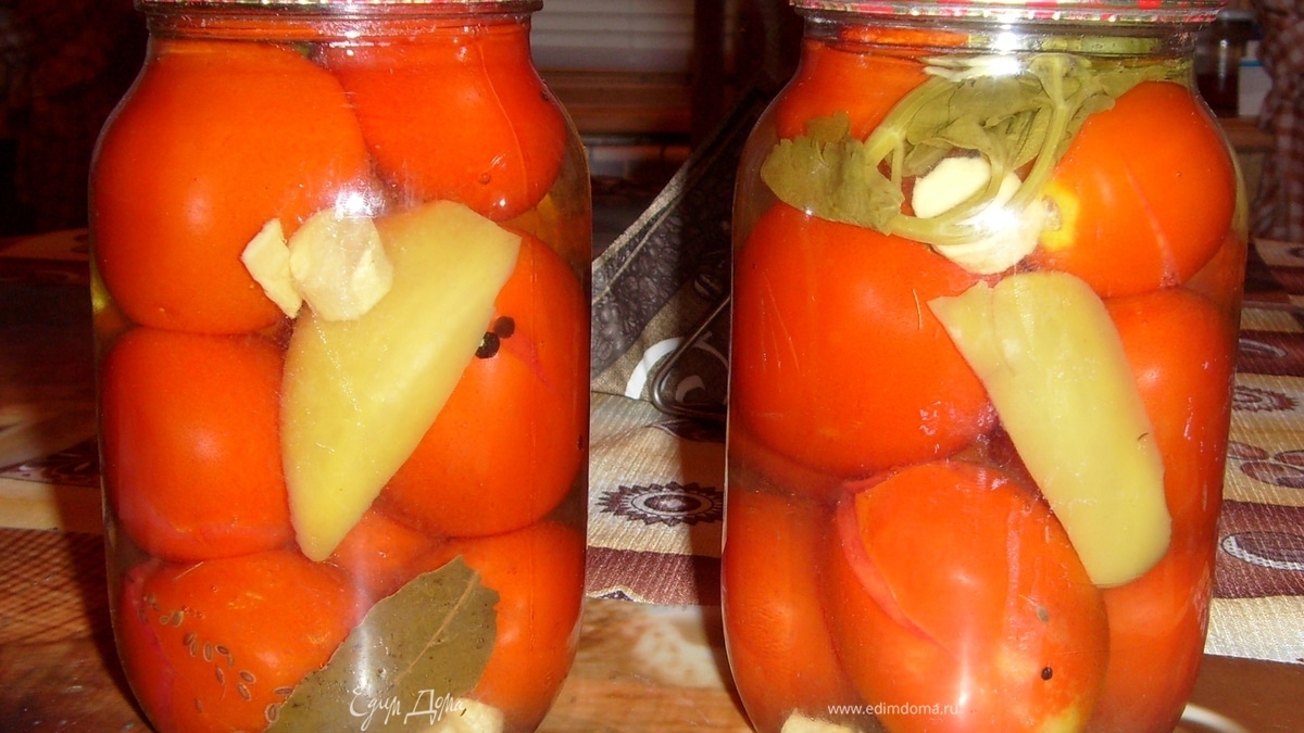 - Шаг 3Перед последним слоем помидоров укладываем 2–3 стебля листового сельдерея и по бокам разрезанный на 4 части очищенный болгарский перец. Сверху укладываем кольцом укроп, а за неимением онного сыпем 1ч. л. сухого семени укропа, можно купить в аптеке или у бабок на базаре. Накрываем простерилизованной крышкой.