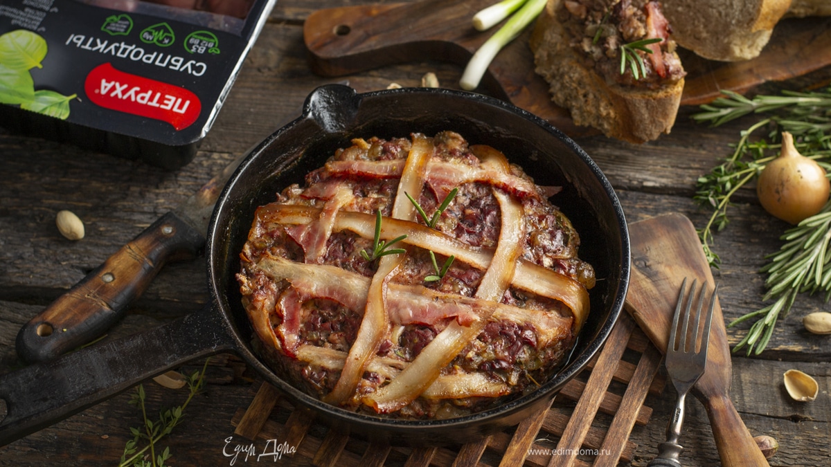 Бекон нарезаем тонкими полосками, делаем решетку из полосок бекона на паштете. - Шаг 13