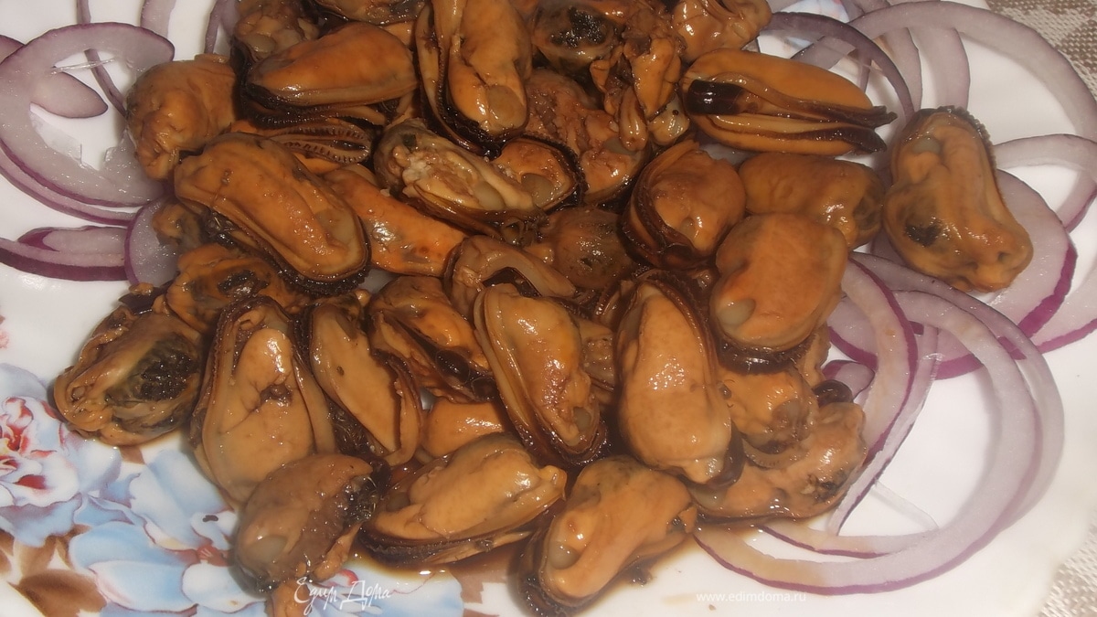 Нарезать лук тонкими кольцами. Выложить на блюдо. Поверх лука выложить мидии. Полить соусом. Приятного аппетита!