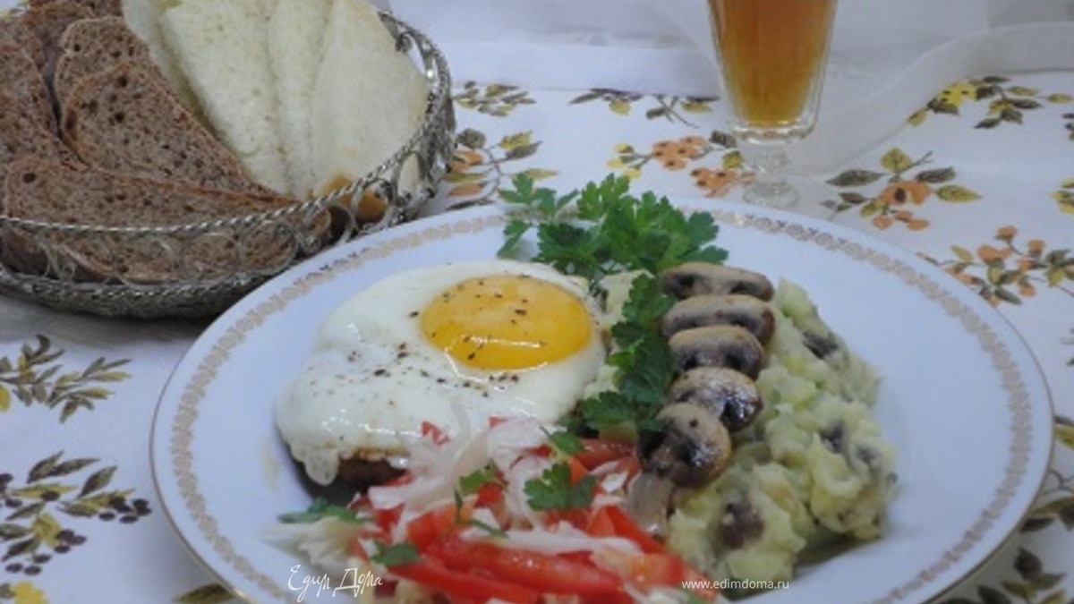 Возможно, вы тоже видели на ТВ передачу «Пять ужинов». Ведет ее шеф-повар Андрей Бова. Он знакомит с простыми, но вкусными домашними рецептами. Этот рецепт привлек мое внимание оригинальностью пюре, автором которого является Андрей Бова. Салат при подаче я добавила от себя. Очень уж он осенний — капуста и помидоры с оливковым маслом и свежемолотым перцем.
