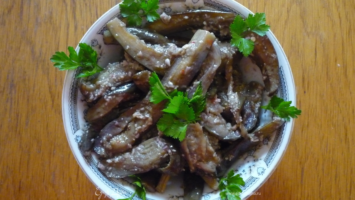 - Шаг 1Оставляем баклажаны в холодном месте минимум на 12 часов. Перед подачей к столу выкладываем в салатник, добавляем толченые грецкие орехи и зелень петрушки, перемешиваем. Приятного аппетита!!!
