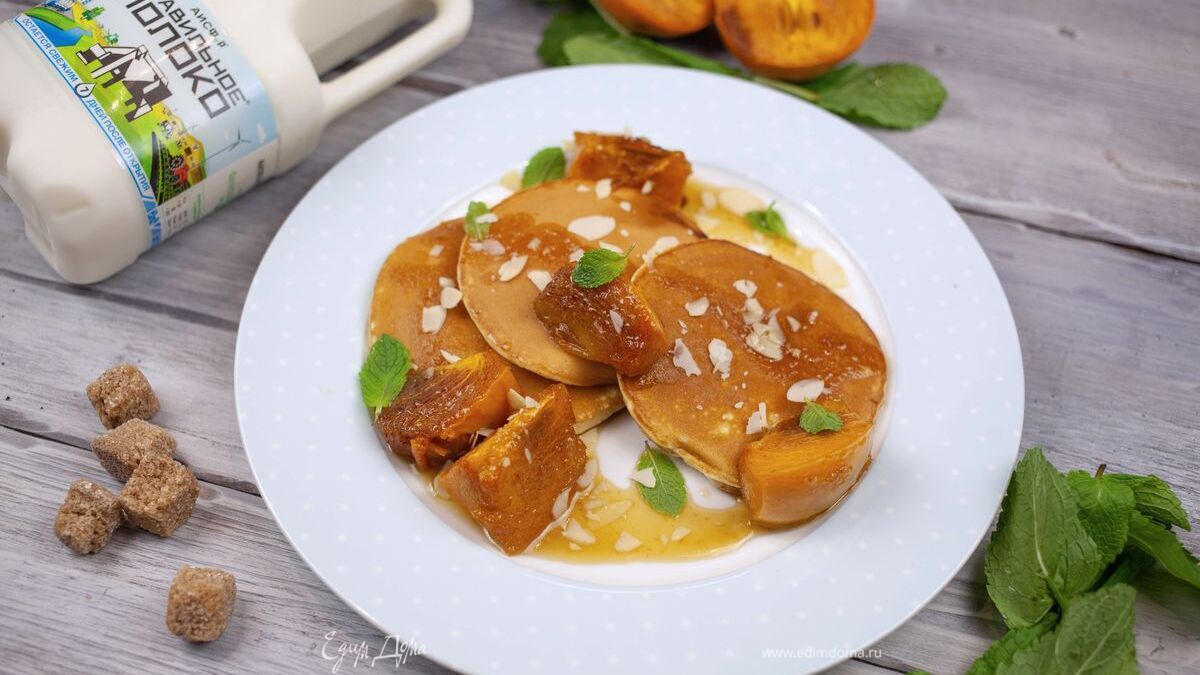 Выложите на тарелку готовые оладьи с обжаренной хурмой. Подавайте, украсив мятой.