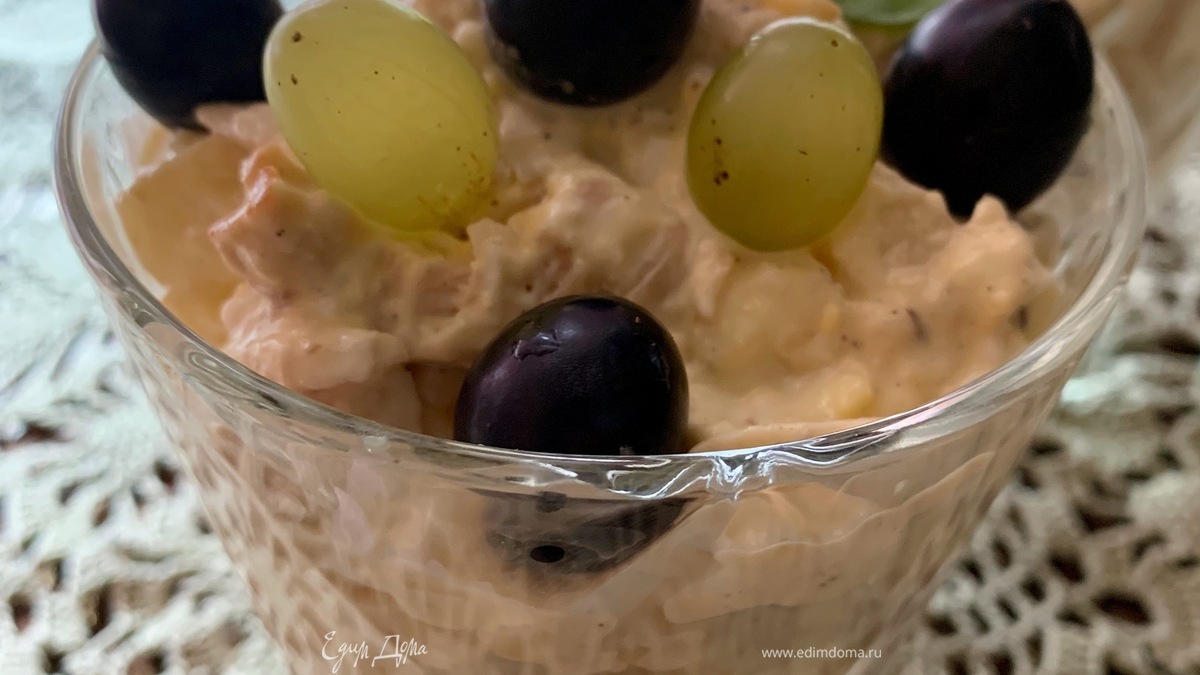 Сварить яйца, натереть на терке. Нарезать куриное филе, натереть сыр, нарезать ананасы. Все размешать, добавить горсть винограда (без косточек). Посолить, заправить майонезом. - Шаг 3