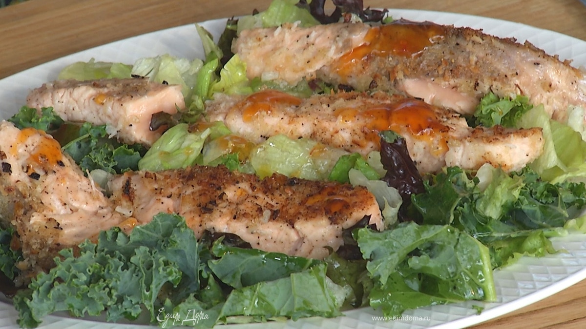Салат переложить на тарелку, сверху выложить рыбу, полить острым соусом.