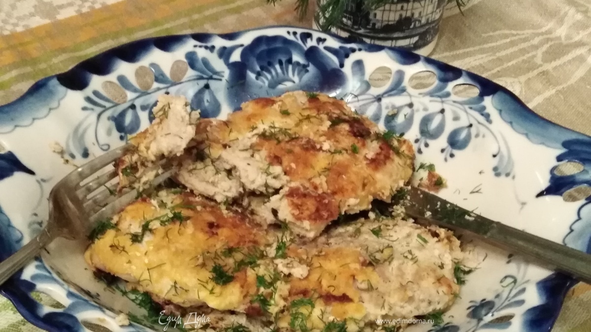 Каждый кусок смазать яично-сметанной смесью. Обвалять в панировочной смеси. Выложить на разогретую сковороду с растительным маслом. - Шаг 3