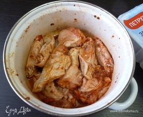 Куриные крылья ТМ «Петруха» разрезать по суставам. Самый кончик нам не нужен. Добавить к крыльям острую аджику и оставить на ночь мариноваться. Моя аджика острая, соленая, там много специй, поэтому я больше ничего не добавляла. Вместо аджики можно взять любую приправу для птицы или просто поперчить и посолить.