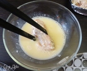Затем обмакнуть в разболтанные яйца. Затем снова в муку. И в яйца.