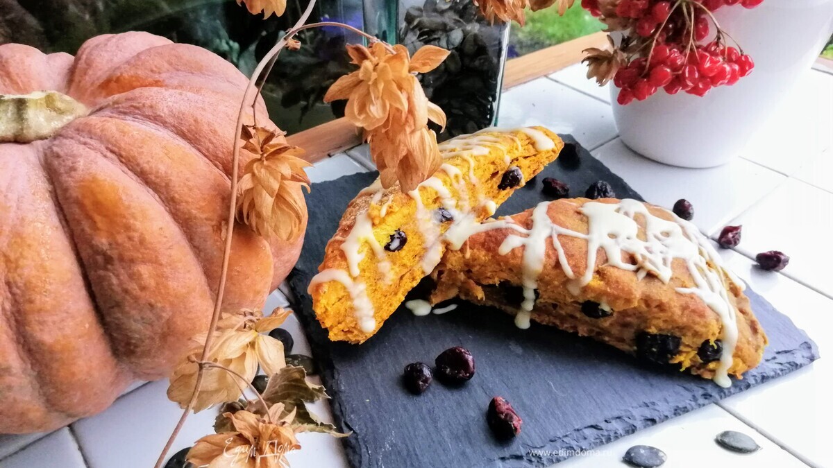 Эти сконы хрустящие снаружи и невероятно пушистые и сочные внутри! Сочность сконов происходит из смеси сметаны, молока и тыквенного пюре. Пюре я готовила сама из тыквы сорта хоккайдо. Она имеет невероятно яркий оранжевый цвет, употребляется в пищу с кожицей и содержит мало жидкости. Тыкву я запекаю в духовке, таким образом она избавляеться от лишней жидкости. Множество вкусных специй — корица, гвоздика и имбирь — придают этим булочкам удивительно домашний аромат и напоминают о приближающемся Рождестве. Эти сочные тыквенные булочки с клюквой — идеальное сладкое сопровождение для осеннего перерыва на кофе!