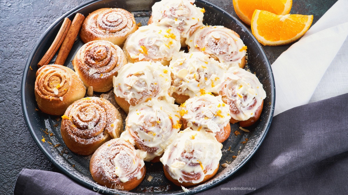 Готовые булочки сразу смажьте глазурью. Украсьте цедрой апельсина.