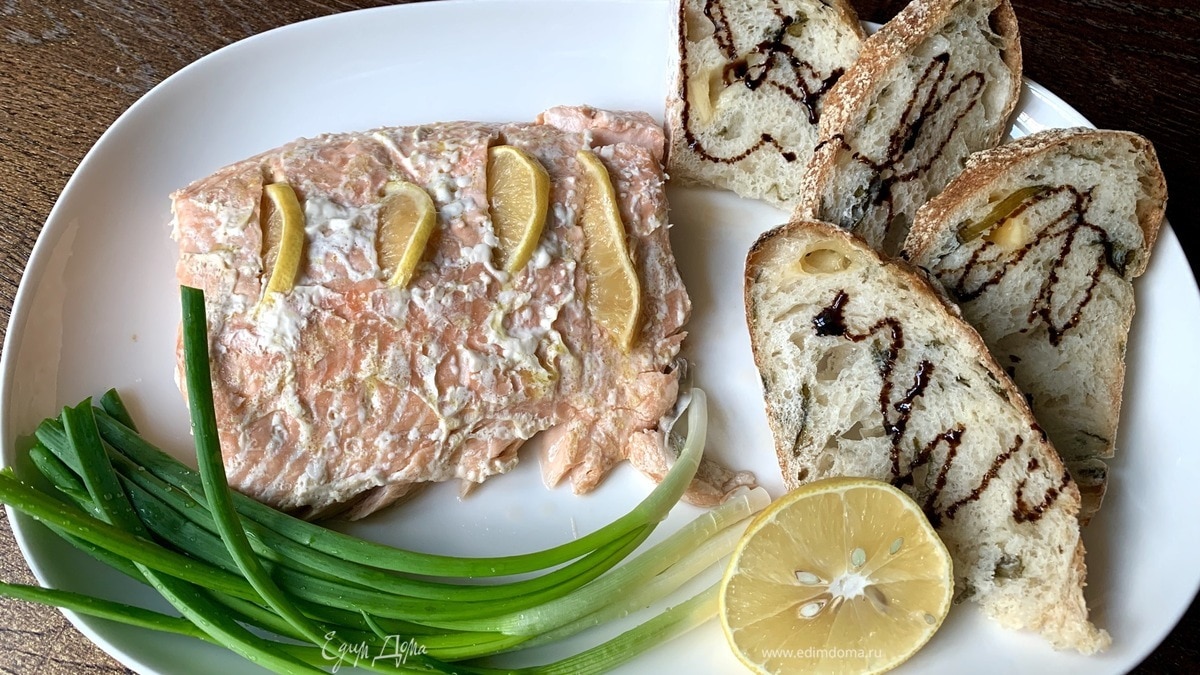 Хороший кусок рыбы вымыть, просушить бумажным полотенцем. Сделать ножом вертикальные полоски, нарезать лимон на дольки и положить в разрез рыбы. Посолить, смазать оливковым маслом. Завернуть в фольгу. Духовка — на 180°C. Выпекаю 25–30 минут. - Шаг 2