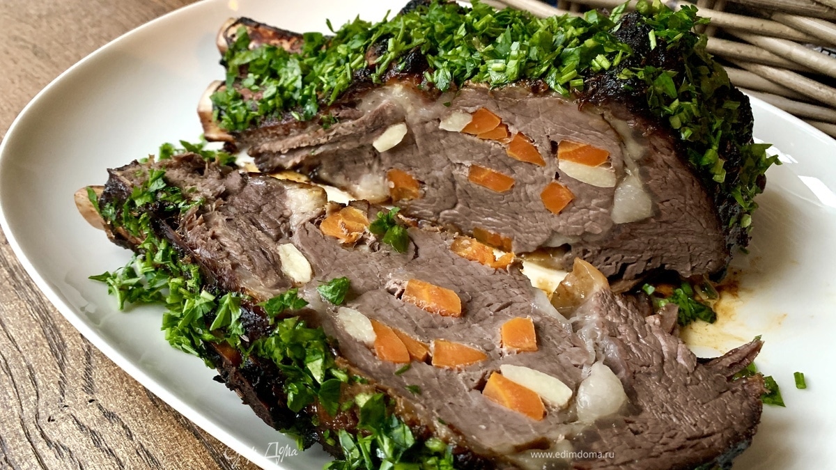Мясо нарядно смотрится на праздничном столе, можно шпиговать один кусок морковью, другой — зеленой спаржей или свеклой. Очень эффектно получается! - Шаг 9