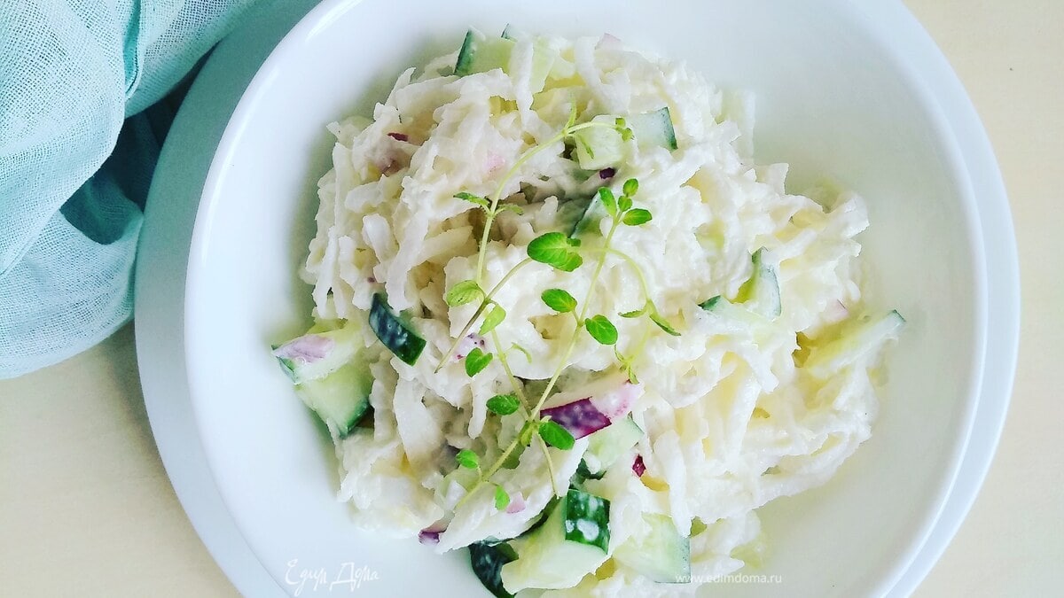 Предлагаю приготовить очень простой салатик, который заслуживает вашего внимания. Этот салат прекрасно подойдет тем, кто следит за фигурой и здоровьем. Ведь дайкон просто кладезь полезных микро- и макроэлементов!