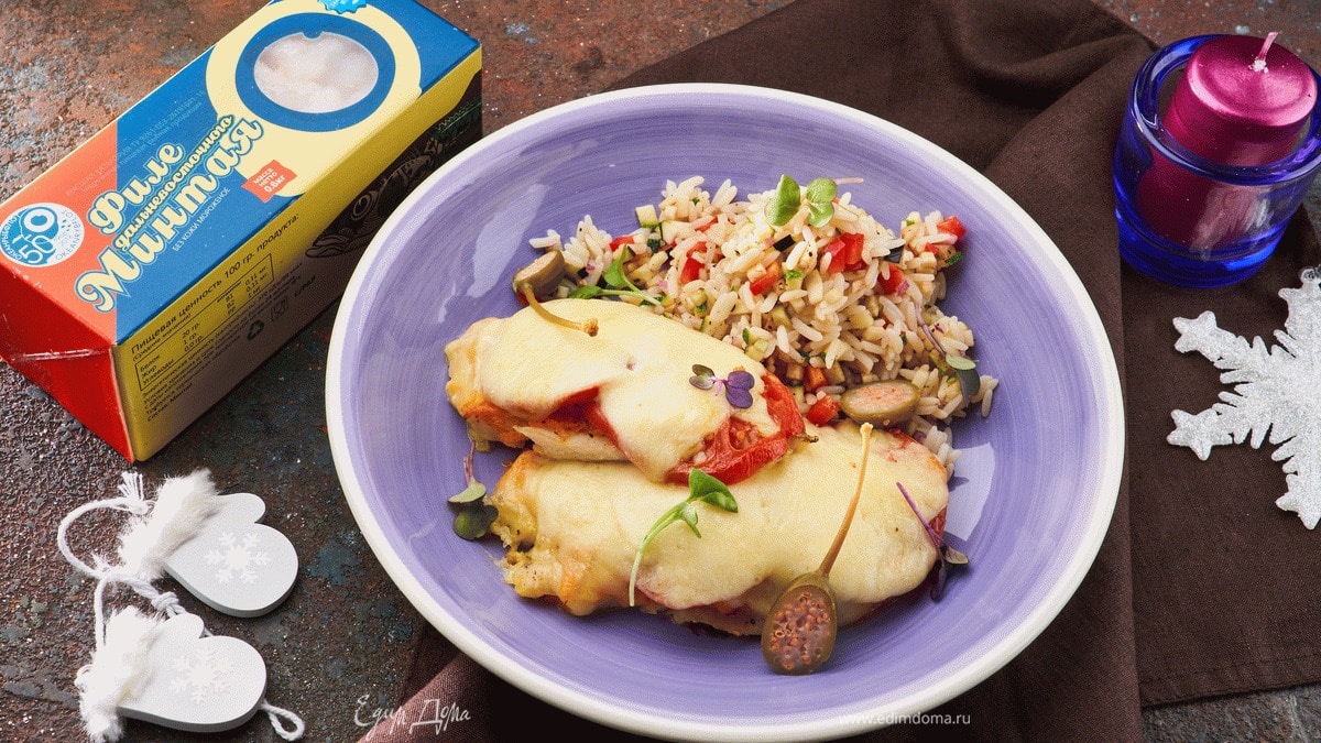 На рыбу выложите обжаренные овощи, потом кружочки помидоров и сыра. Запекайте в духовке 15 минут при 185°С.