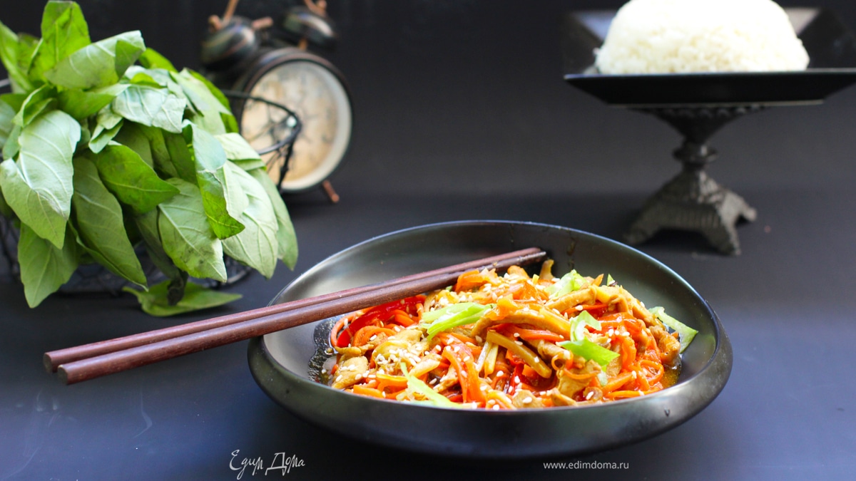 Готовое блюдо присыпать слегка наискосок нарезанным зеленым луком и капнуть немного кунжутного масла. Можно посыпать кунжутными семечками. Подавать с рисом.