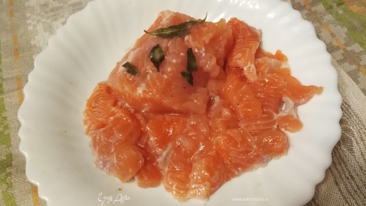 Форель разобрать на филе. Сварить рассол из воды, сахара и соли. Остудить. Куски рыбы пересыпать поломанными листьями лавра и смесью свежемолотого перца. Залить остывшим рассолом. Накрыть емкость крышкой. Убрать в холодильник на сутки. Далее хранить в рассоле в холодильнике или обсушить бумажным полотенцем. Обернуть пленкой куски рыбы и убрать в морозилку. - Шаг 2