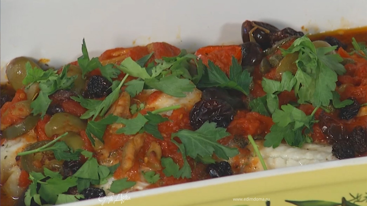 В форму добавить половину соуса, сверху выложить рыбное филе. Посолить, поперчить и посыпать орегано.