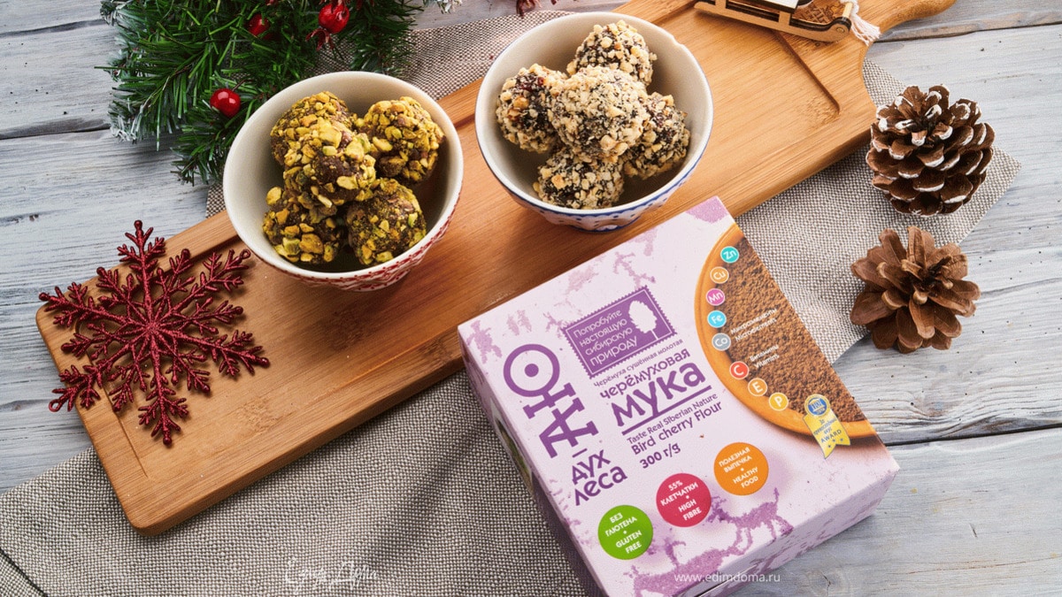 Добавьте кедровую муку и какао. Добавьте черемуховую муку ТМ «Аю — дух леса», перемешайте. Сформируйте шарики. - Шаг 6