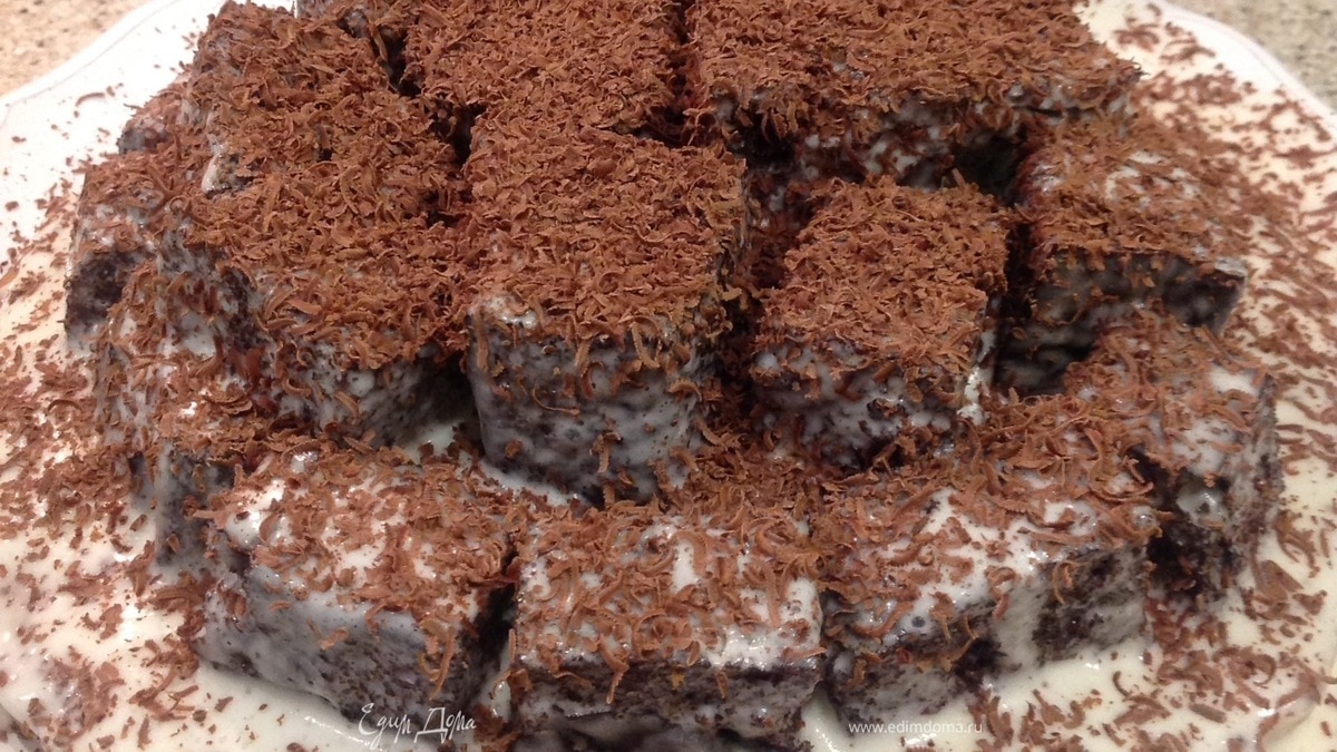- Шаг 4Вынуть из духовки, дать остыть. Сметану взбить с сахарной пудрой до пышной пены. Разрезать пирог на квадратики, выложить горкой, залить сметанным кремом. По желанию посыпать шоколадной стружкой. В идеале нужно поставить в холодильник на два часа. Приятного аппетита!